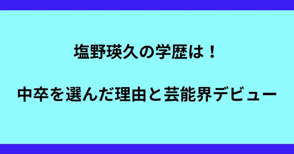 俳優として活躍中の塩野瑛久さん。 大河ドラマ『光る君へ』で一条天皇役を演じ、その演技力が高く評価されています。 しかし、塩野さんの学歴が中卒だということをご存知でしょうか? なぜ高校に進学しなかったのか、そして芸能界デビューまでの道のりが気... -